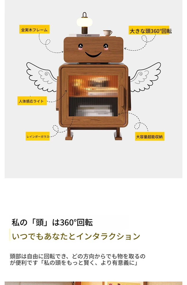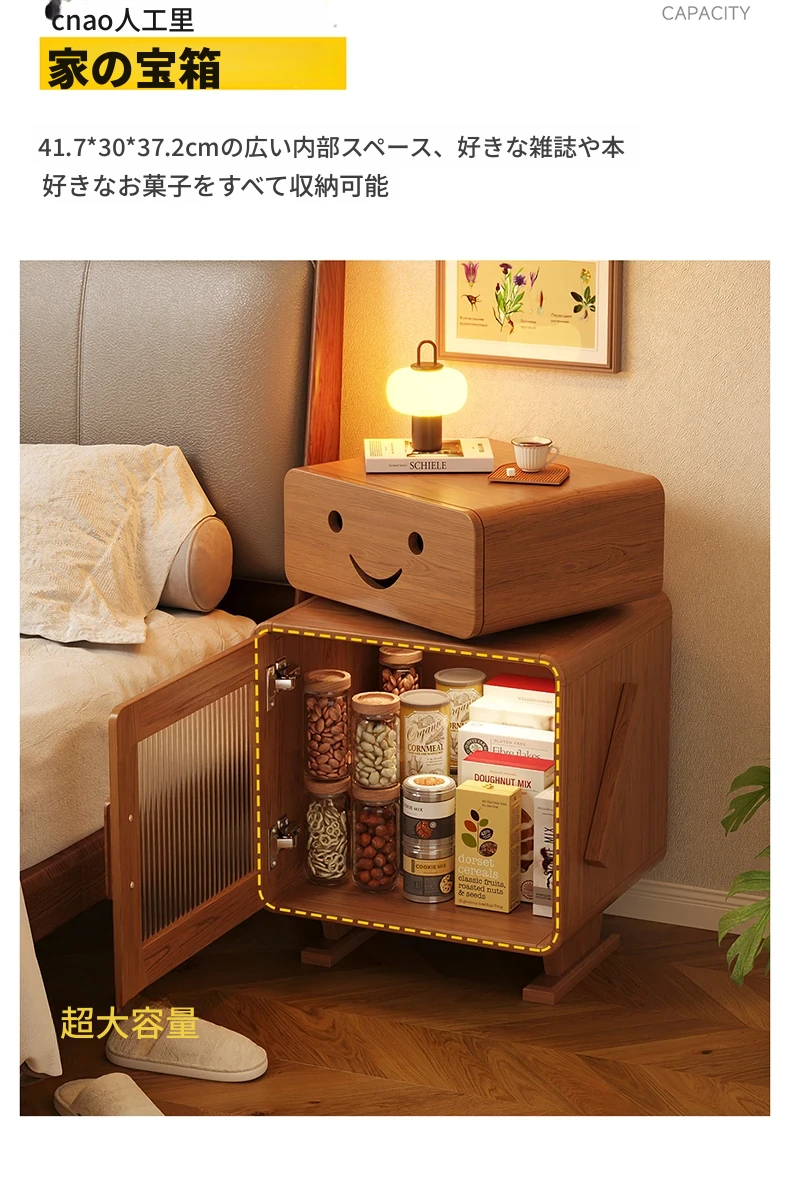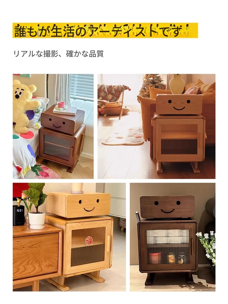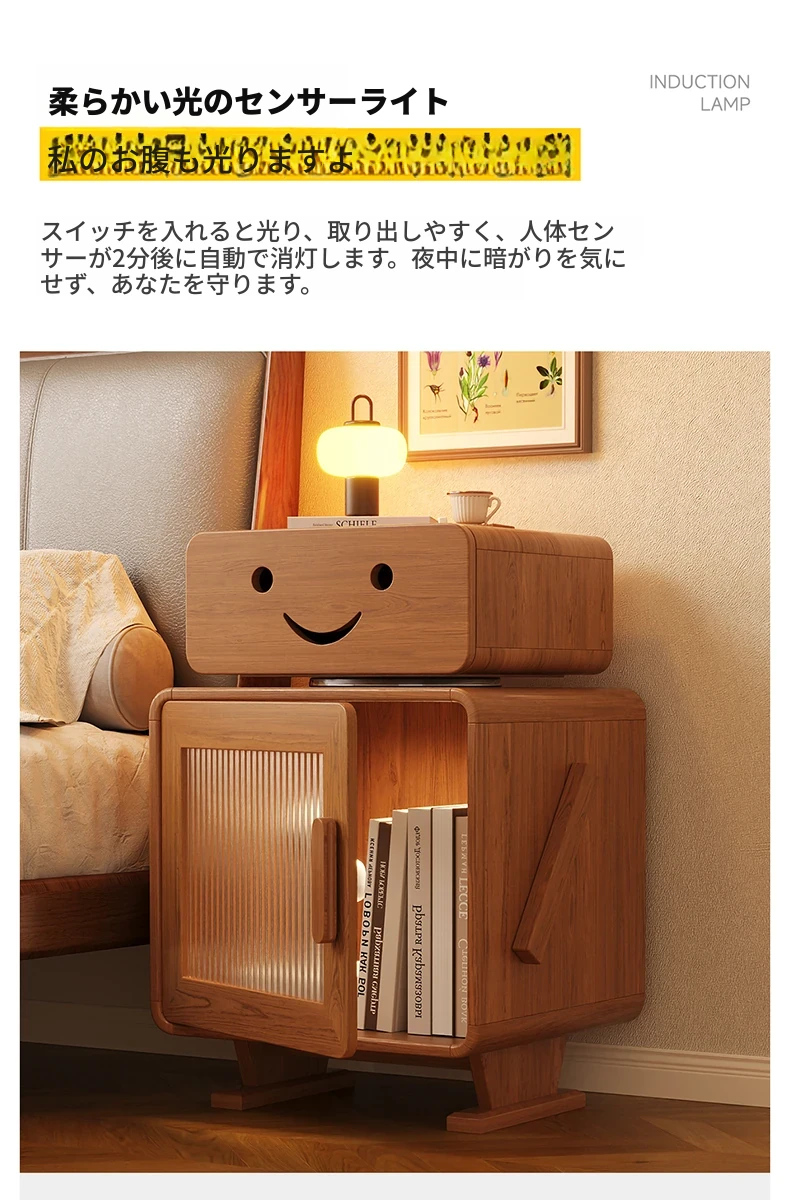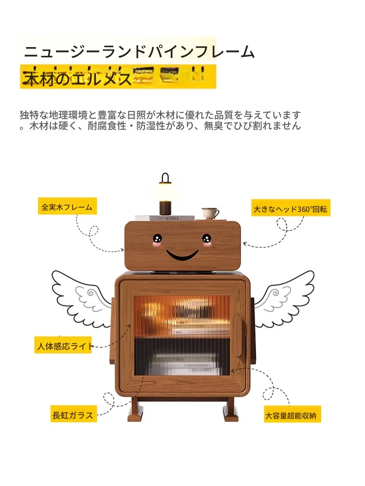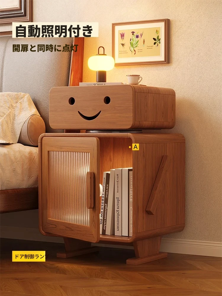 2024年新作!全実木製ロボットデザインの子供用ナイトテーブル - シンプルでモダンな寝室にぴったりの収納付きベッドサイドキャビネット!子供たちの夢を叶える可愛いインテリア。