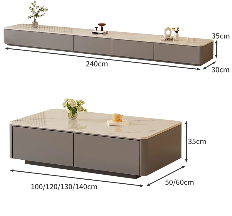 【組み立て不要】1.4m四抽コーヒーテーブル(光沢のある雪山白+グレーキャビネットソフトパッケージ)