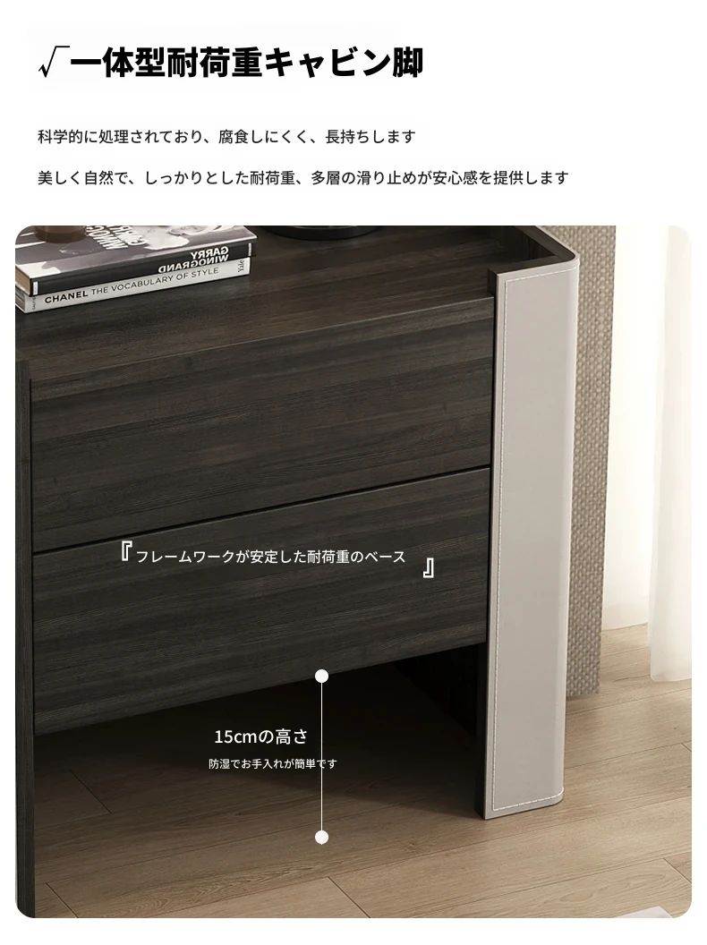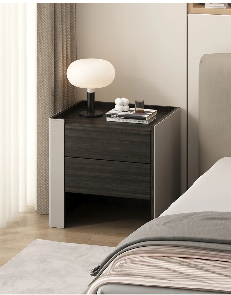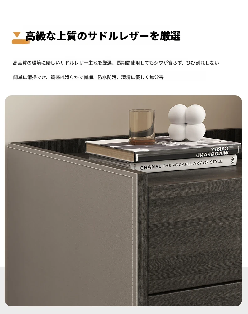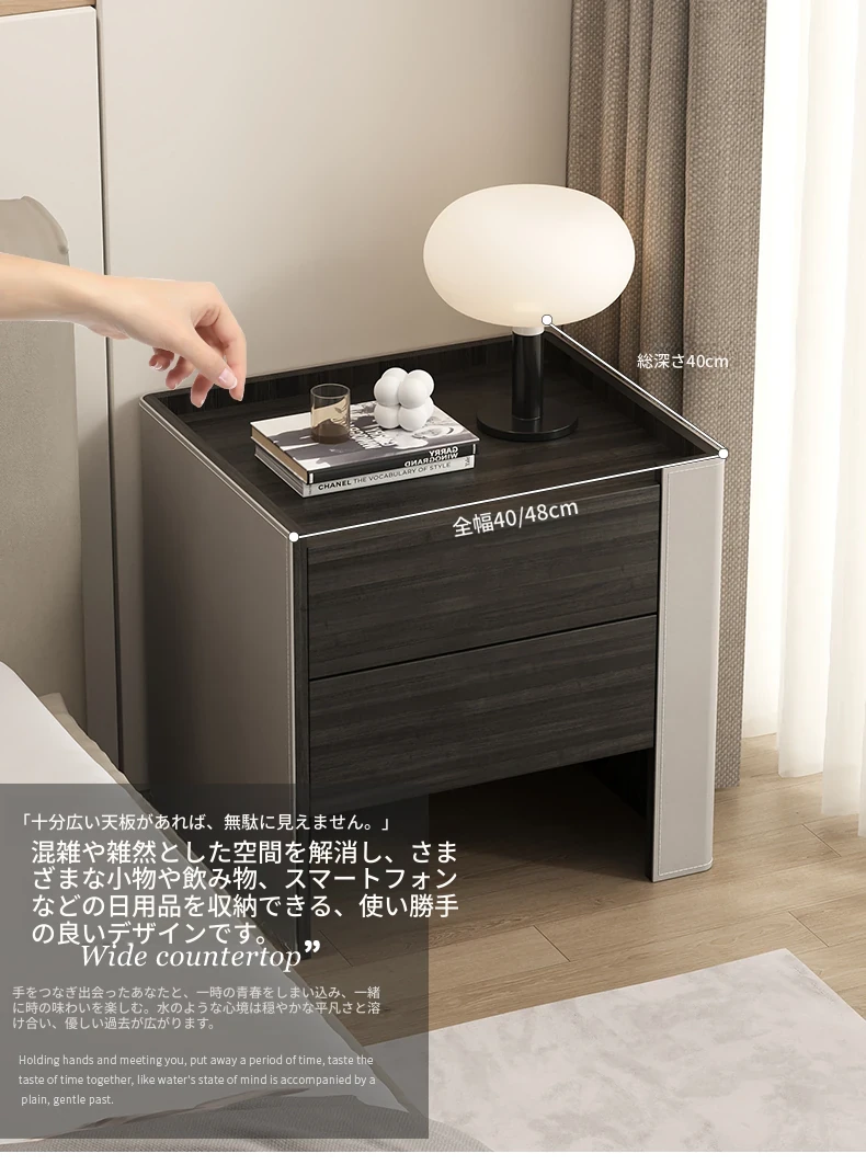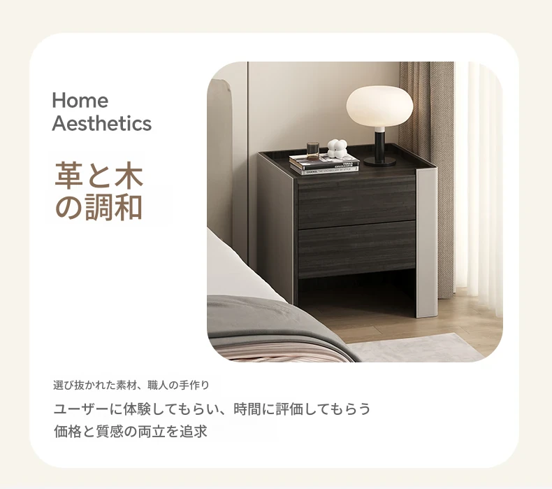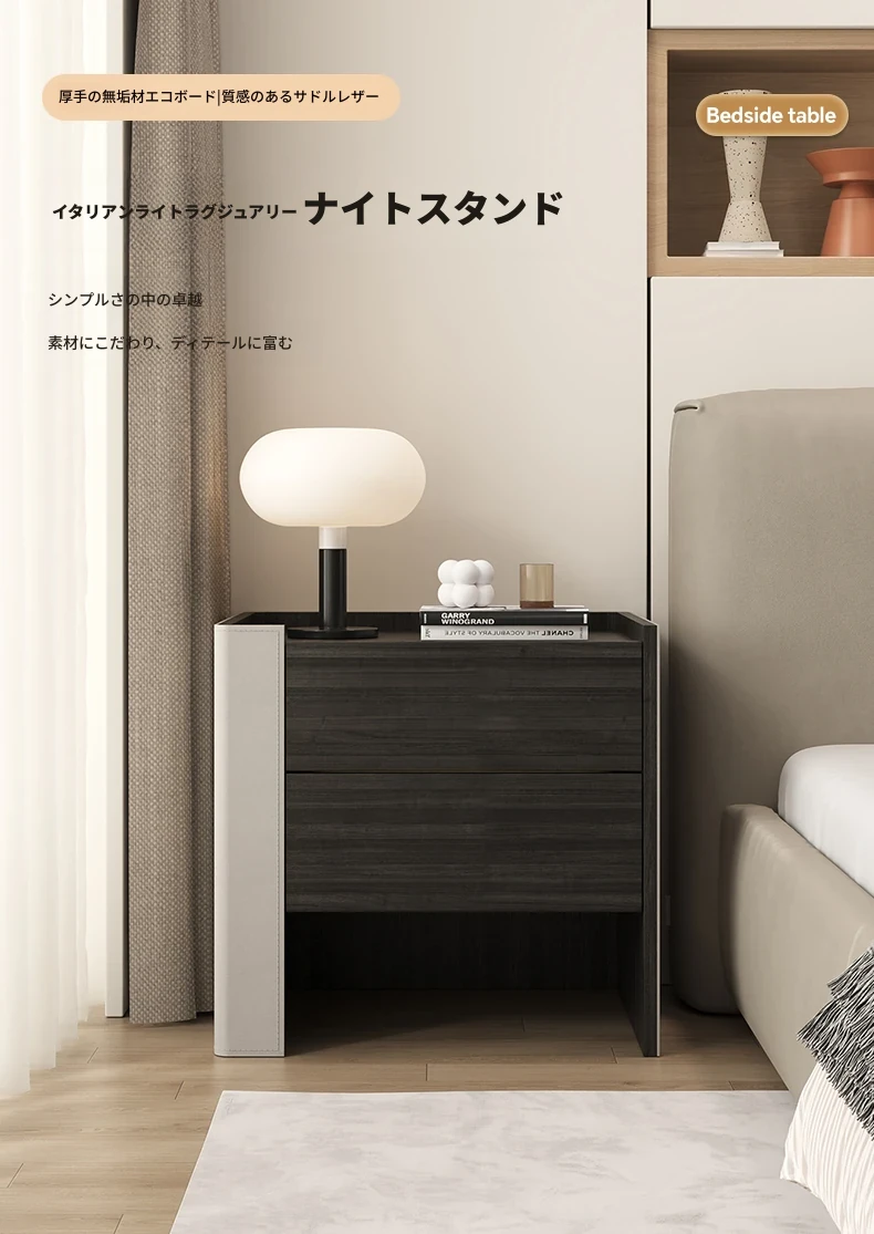 三夢の無垢材ナイトテーブル - シンプルでモダンな2025年新作、ラグジュアリー感溢れるサドルレザー仕立てのベッドサイドキャビネット。あなたの寝室に洗練された雰囲気をプラス!