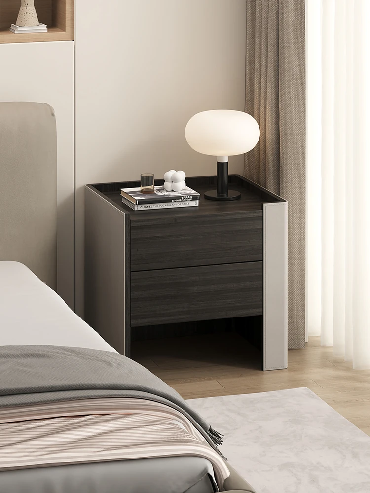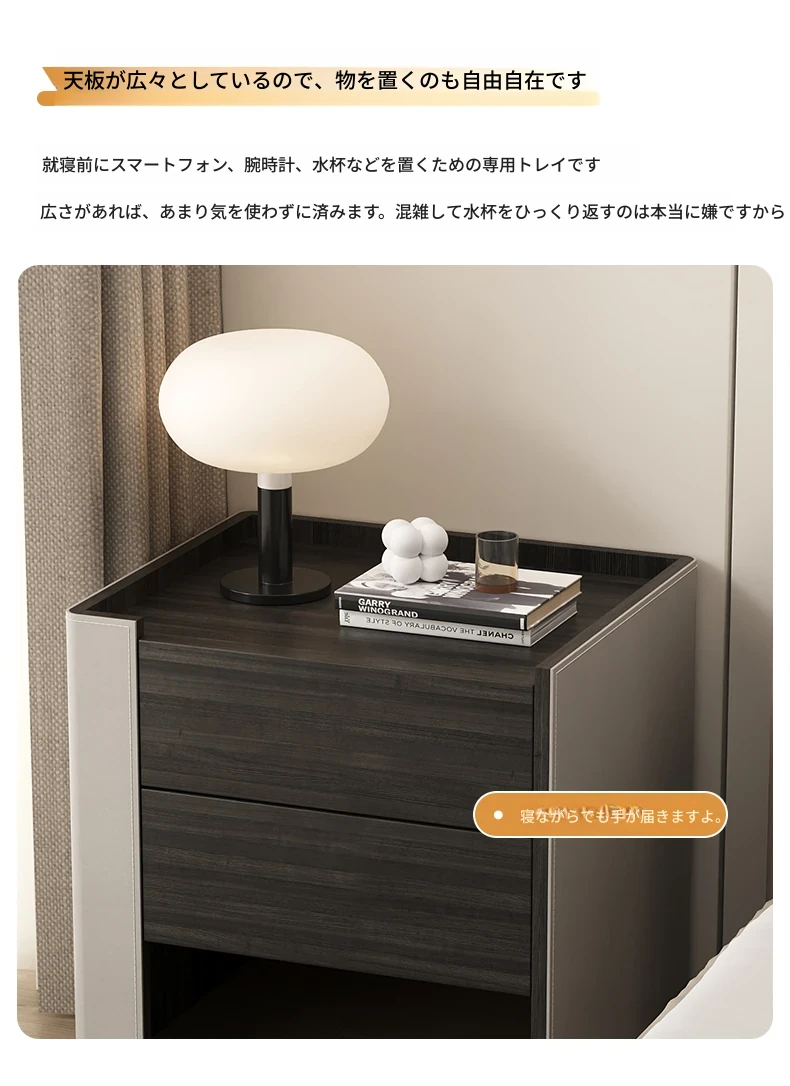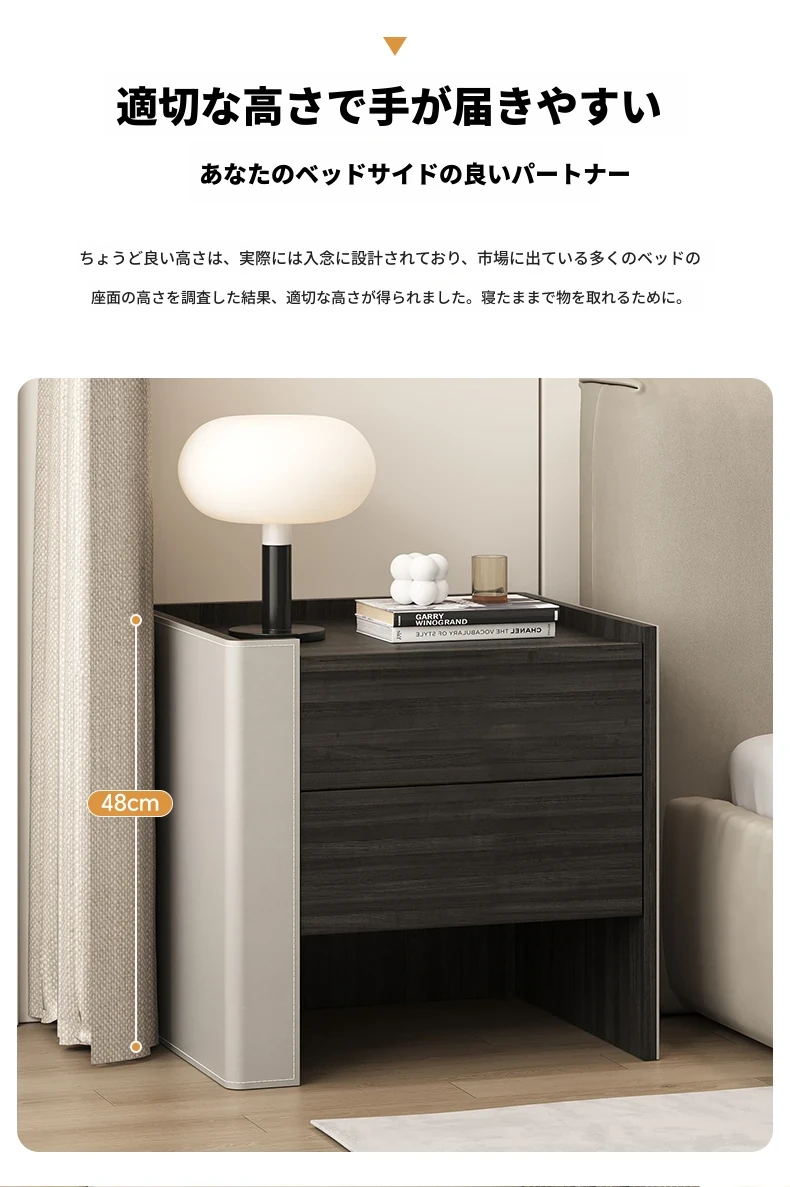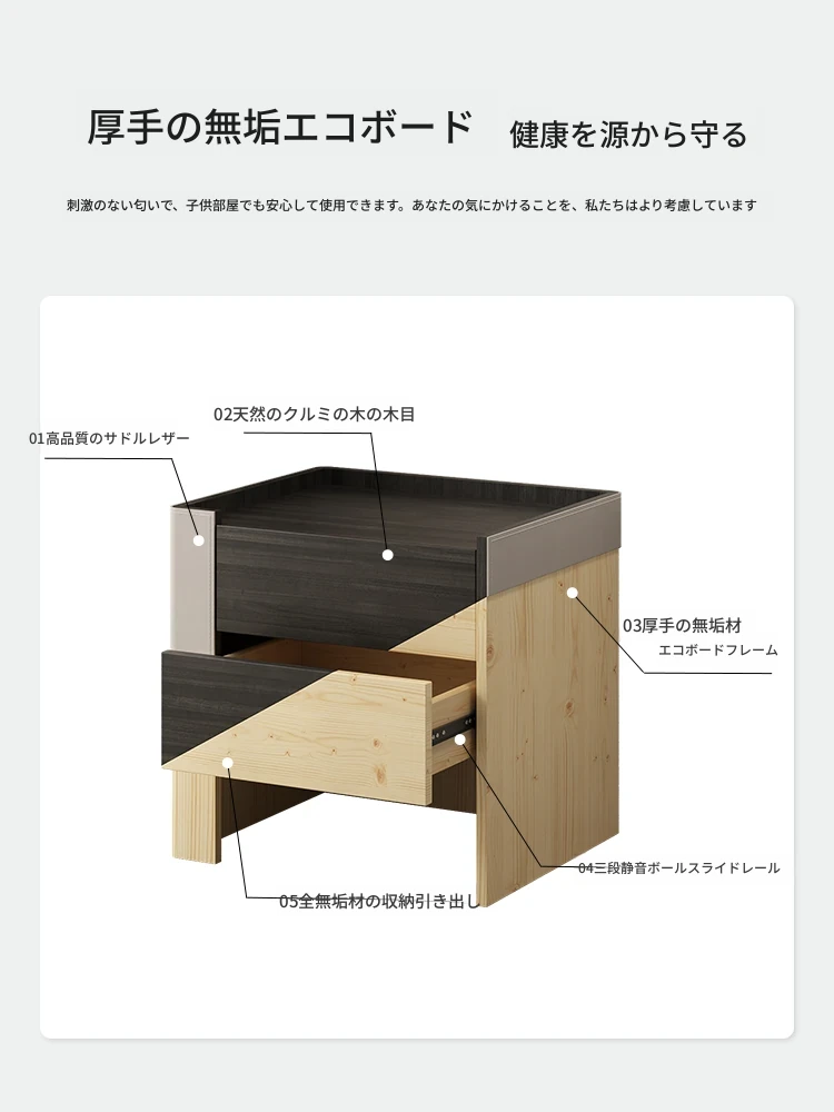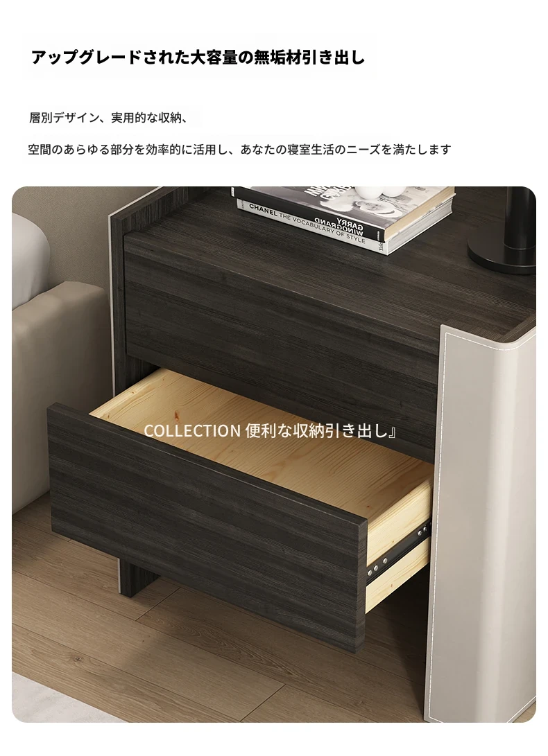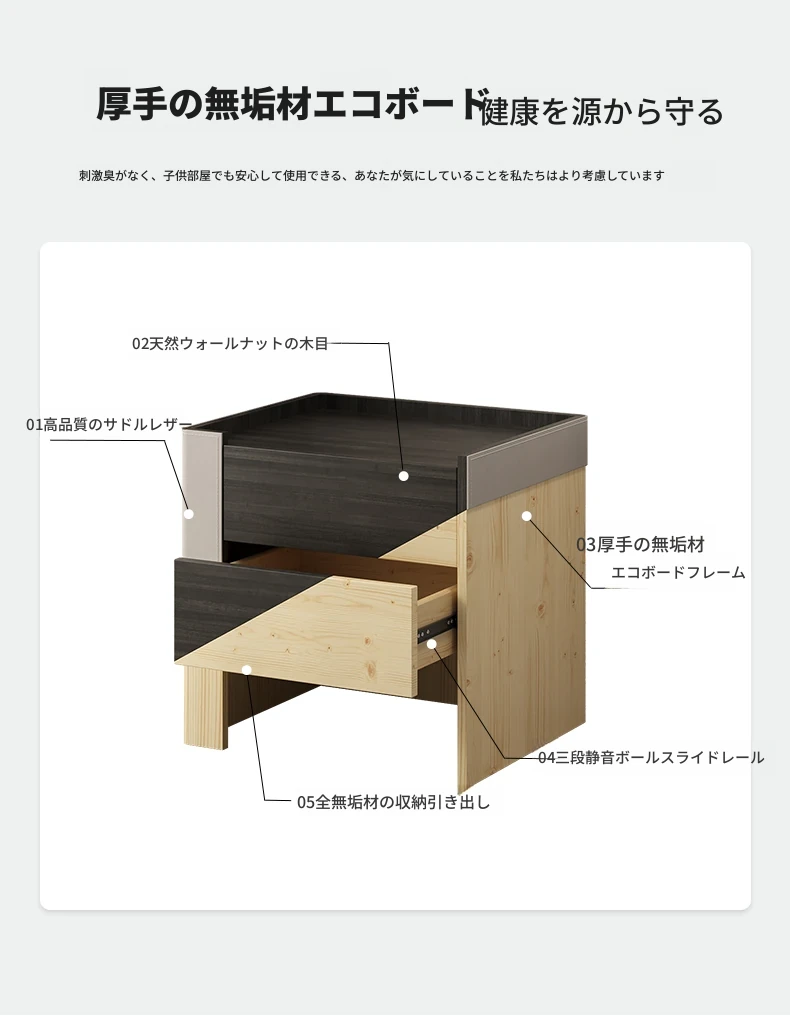 三夢の無垢材ナイトテーブル - シンプルでモダンな2025年新作、ラグジュアリー感溢れるサドルレザー仕立てのベッドサイドキャビネット。あなたの寝室に洗練された雰囲気をプラス!
