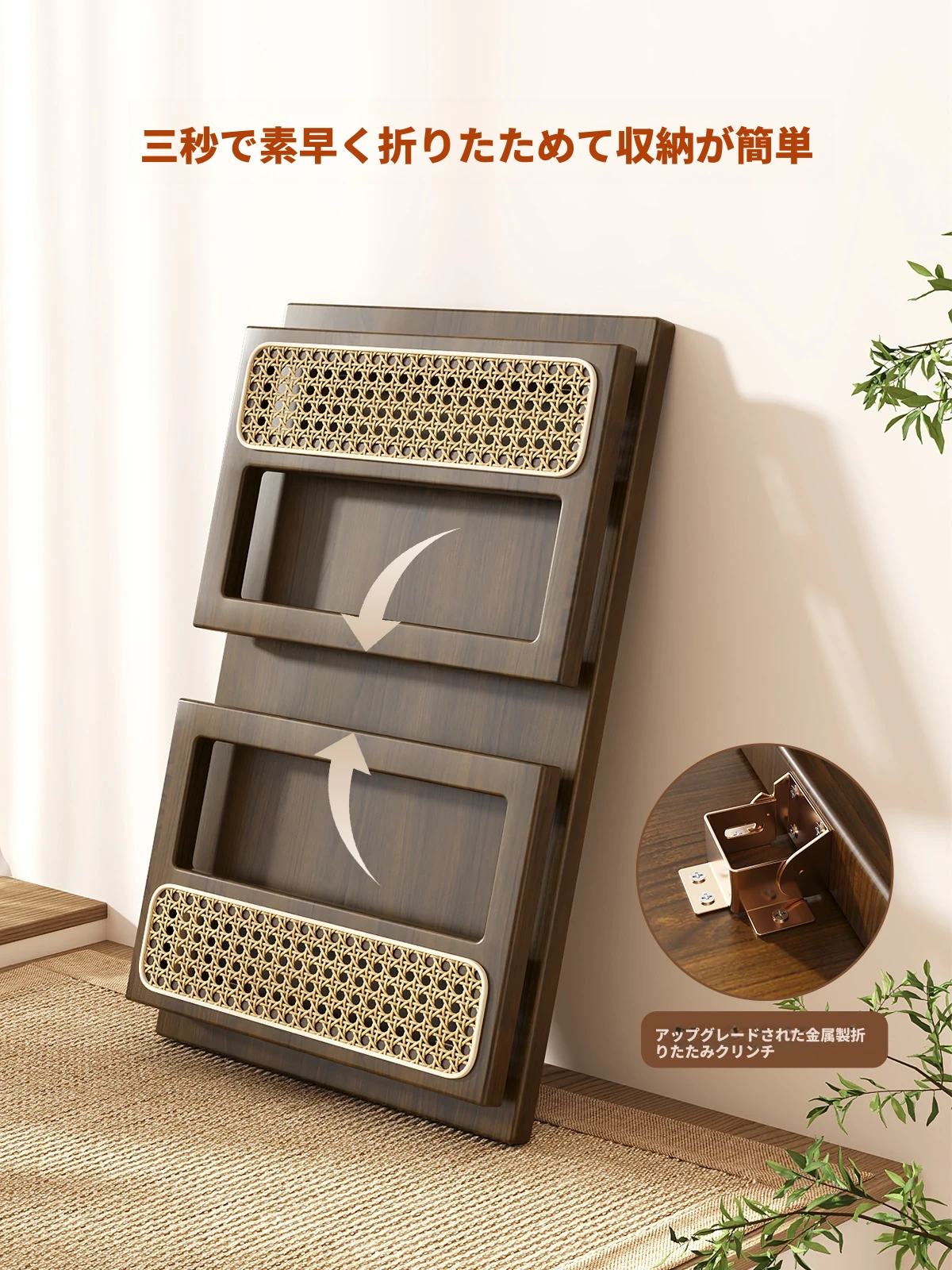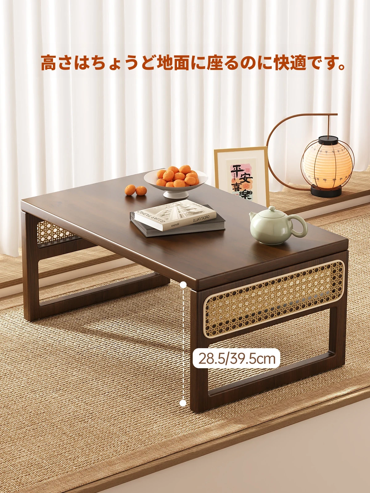 窓辺にぴったり!おしゃれな藤編みミニテーブル - シンプルなデザインで、リビングや寝室での読書や作業に最適。畳の上でも使える低めのテーブルで、快適な空間を演出します。